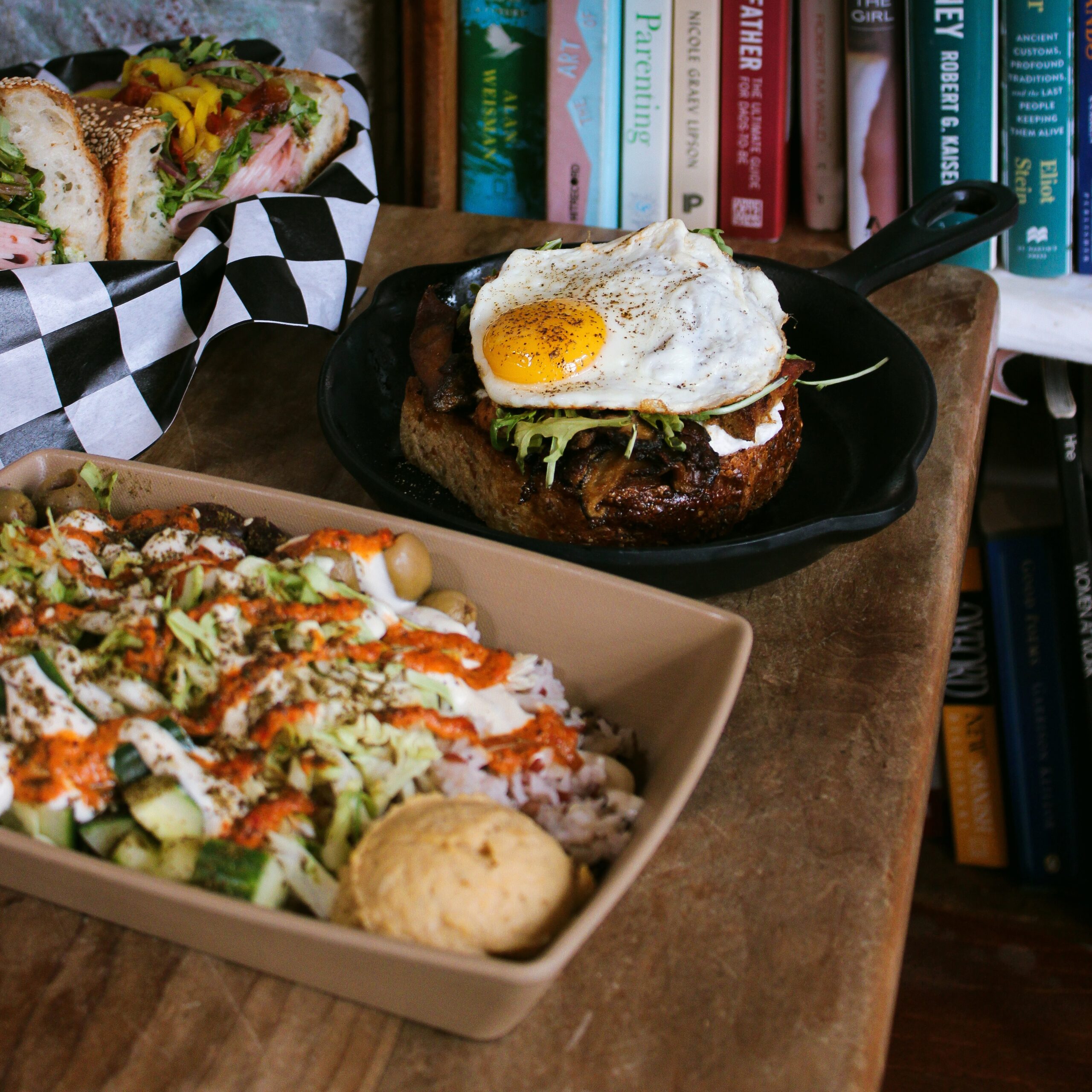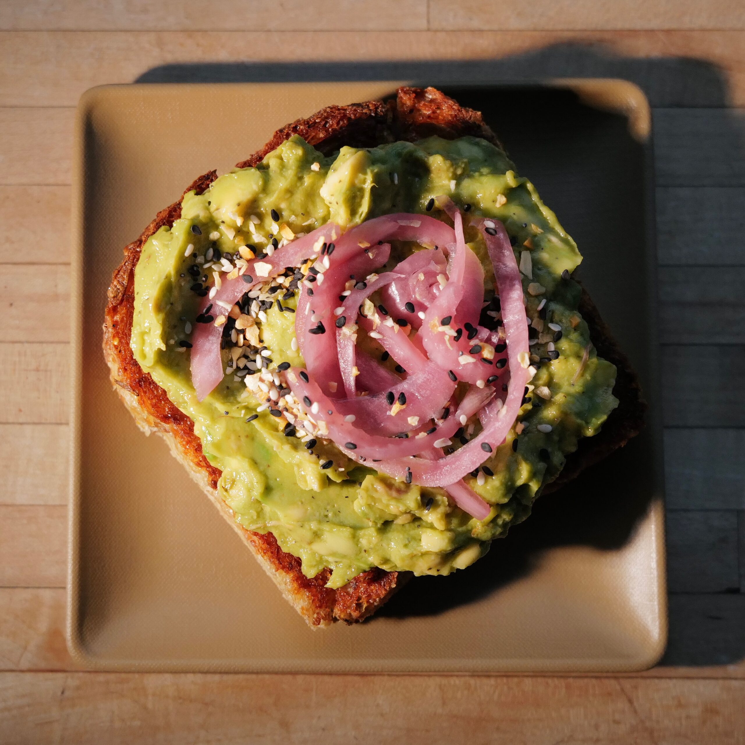 smashed avocado, pickled red onion, everything bagel seasoning, on griddled 7 grain bread. add fried egg $3