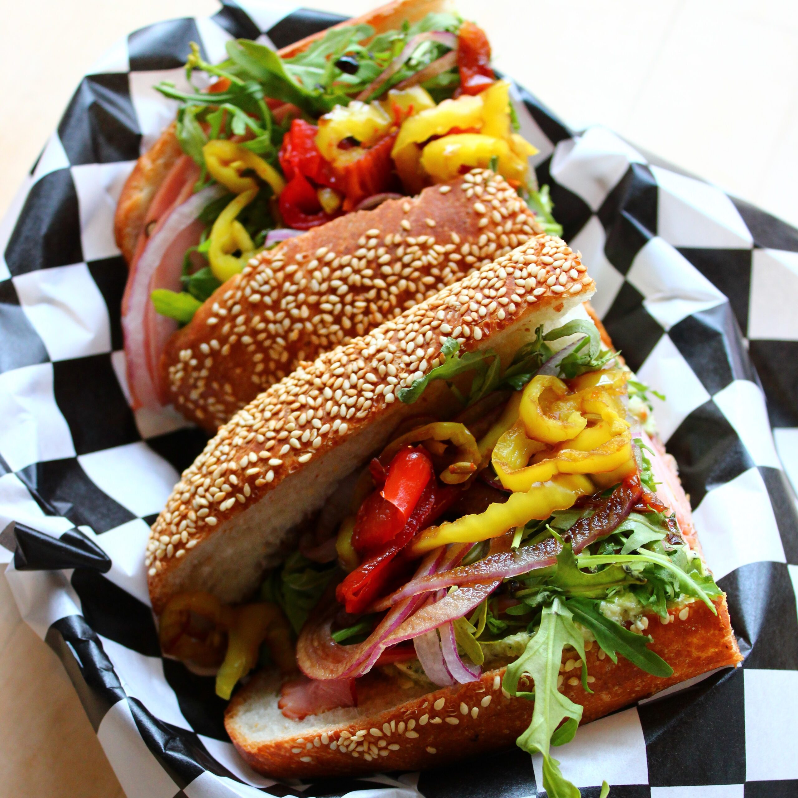 ham, pistachio mortadella, banana peppers, mama lil’s peppers, burrata, red onion, arugula, balsamic, on sesame hoagie