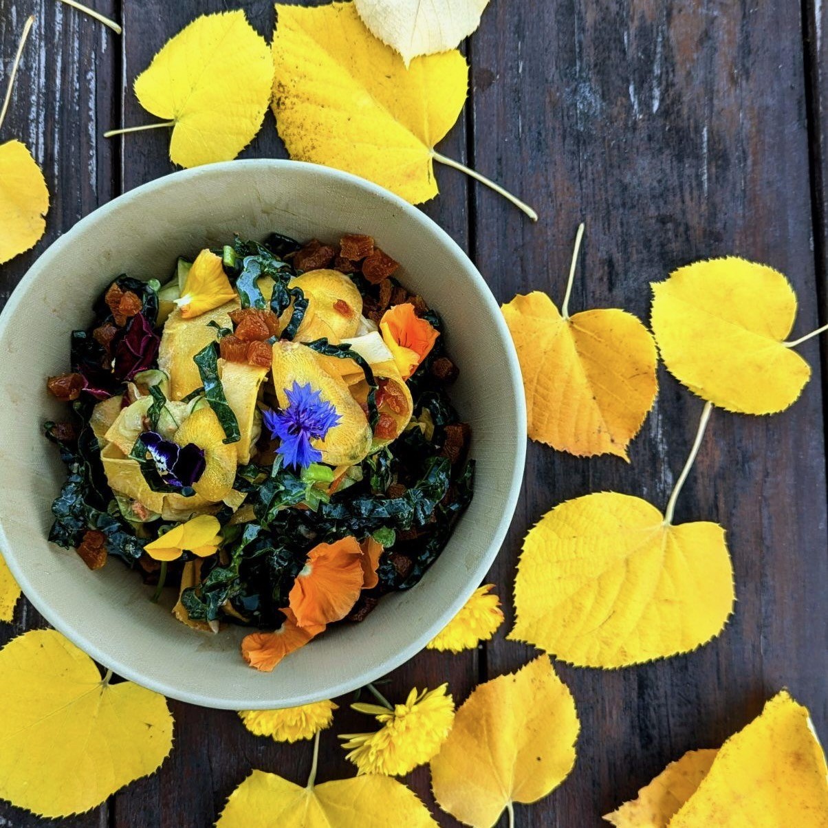 lacinato kale, roasted root vegetables, farro, arugula, chickpeas, dried cranberries, carrot ginger dressing